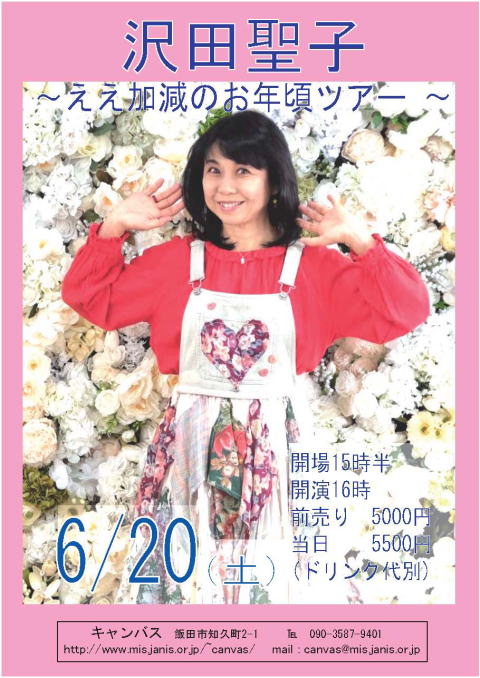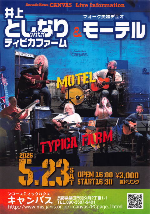 <問い合わせ,電話予約> キャンバス 090-3587-9401 キッチンカノン 0265-24-6774 黄色で示されたLIVEについては下記でチケットを販売しています また,CANVASではメールでも予約を受け付けます [mailto] canvas@mis.janis.or.jp キャンバス 090-3587-9401 キッチンカノン 0265-24-6774 Facebook CANVAS Page