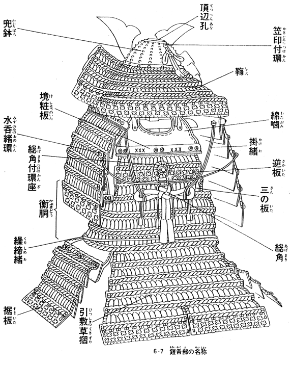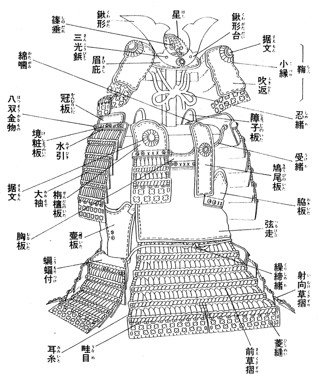 さて、その様にして確立した武士の正装「大鎧・式正鎧」は、まず騎馬戦闘様の防具でありして、体にフィットすると言うよりは体を覆う様にデザインされ、また主たる武器が弓矢でありましたから弓を持つ手の側と、弦を引く手の側との格好が異なり、また弦がひっかららないように胴の部分に一枚皮が張られているものでありました。徒歩の為の便宜はあまり図られておらず、また後の時代にどんどん簡略化されてゆく「大袖」と呼ばれる肩を覆うパーツが特徴的で、つまり「盾」を両肩に下げた格好でありました。この大袖には防御の上での重要な役割があり、半身の体勢で前傾姿勢をとれば前方向の殆んど全てが防具で覆われるようデザインされていました。また、余談ですが大鎧にはその名も「水引」と言うパーツもあります。化粧の板と言うパーツの下に「白赤二色で綾をうつ物」であります。