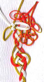 結びと編みは、交互に織り成すことも出来ます。隣の画像は、その例として作ってみたもので、下から順に「三つ編み」・「あわじ結び」・「四つ編み」と来て、最後にみづひきを振り分けて「松」・「竹」・「梅」の三種類の結びで締めたものです。